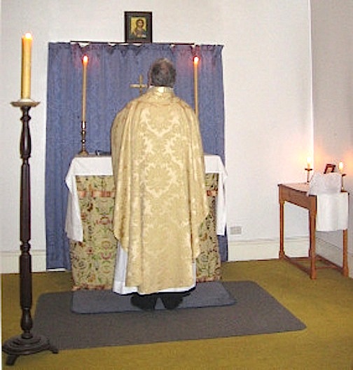 In our former home, we had this tiny chapel in the grounds, dedicated to Saint Mary the Virgin. Lit only by candles and without electricity it shows that a personal chapel with enough room to celebrate a liturgy is possible anywhere there is enough space to erect a single car garage.